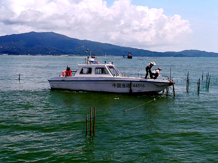 6月19日上午,广东渔政总队台山大队开展“绝户网”等违规渔网具清理整治专项执法行动。