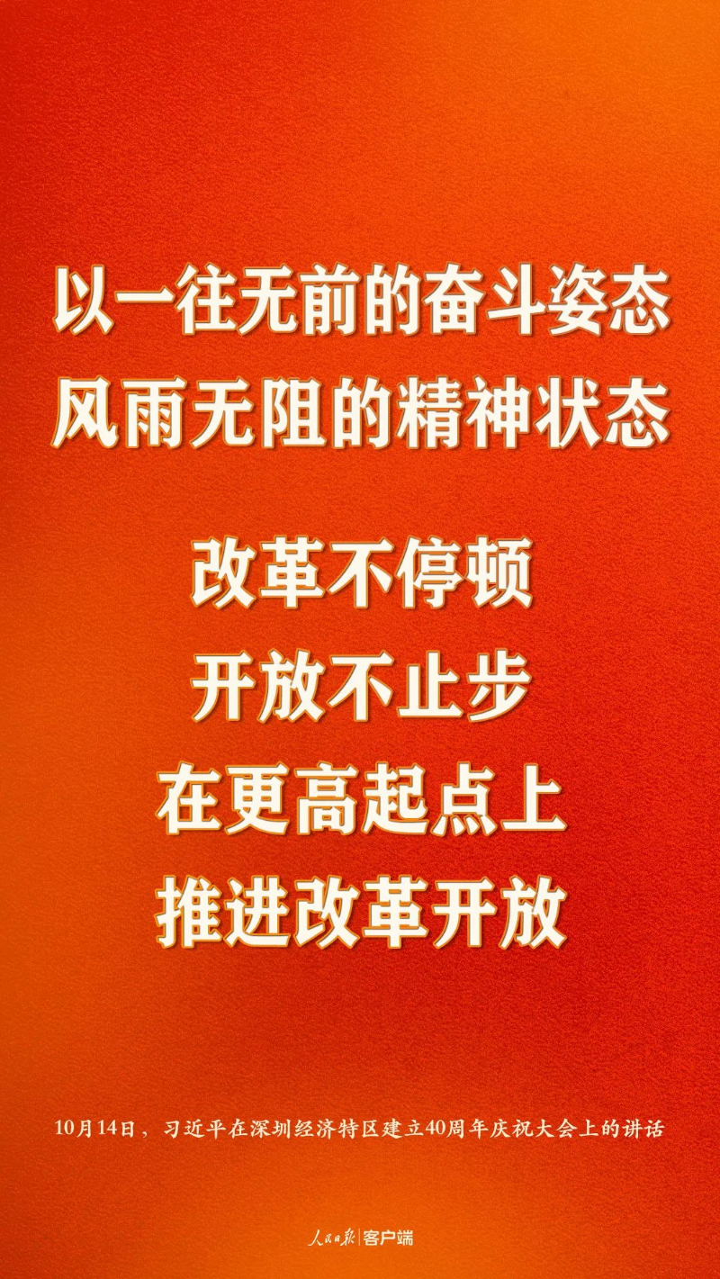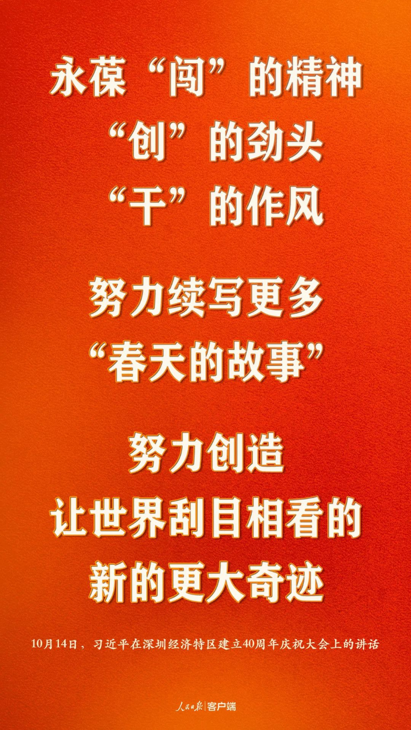四十载波澜壮阔,新征程催人奋进。经济特区的沧桑巨变是一代又一代特区建设者拼搏奋斗干出来的。在新起点上,经济特区广大干部群众要坚定不移贯彻落实党中央决策部署,永葆“闯”的精神、“创”的劲头、“干”的作风,努力续写更多“春天的故事”,努力创造让世界刮目相看的新的更大奇迹!