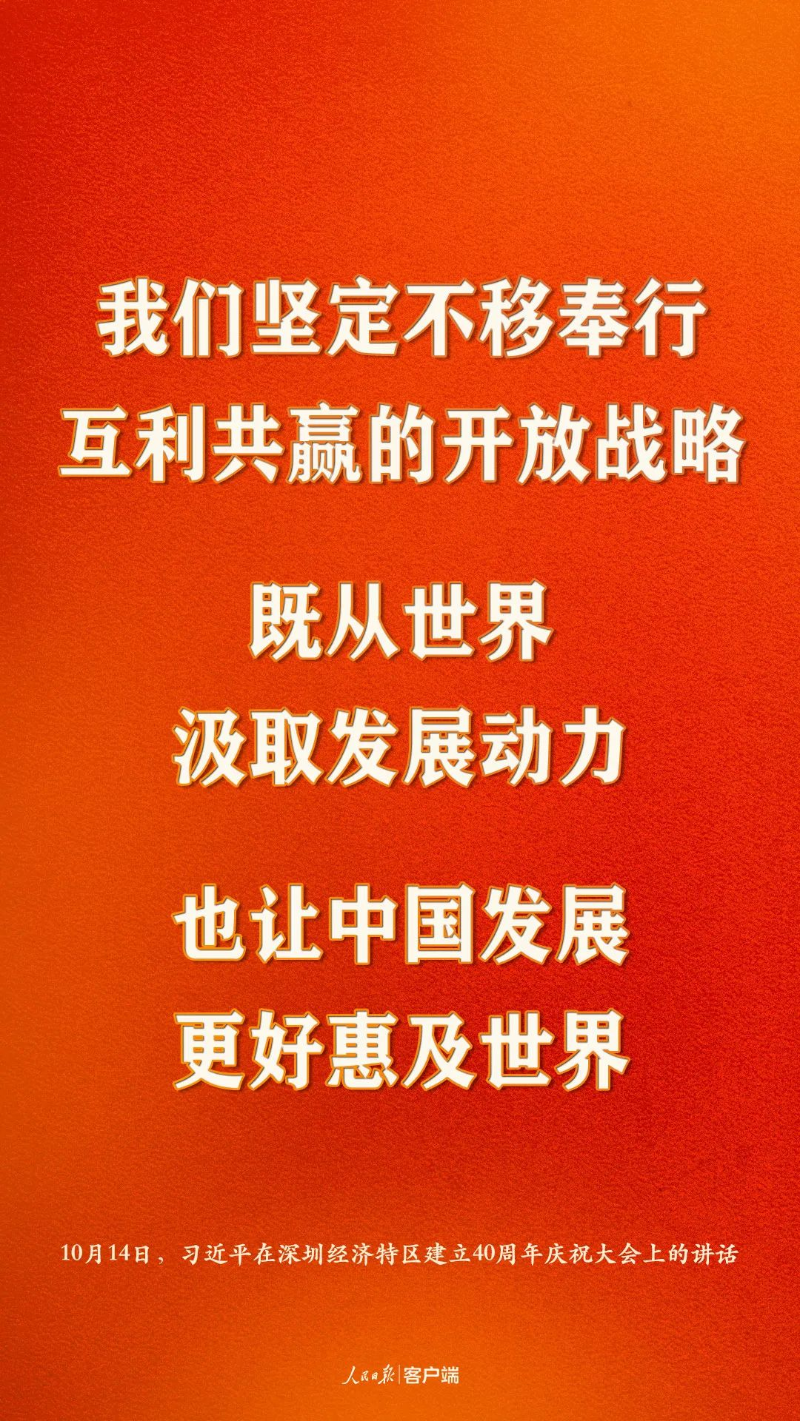 一花独放不是春,百花齐放春满园。我们坚定不移奉行互利共赢的开放战略,既从世界汲取发展动力,也让中国发展更好惠及世界。经济特区建设40年的实践离不开世界各国的共同参与,也为各国创造了广阔的发展空间、分享了发展利益。欢迎世界各国更多地参与中国经济特区的改革开放发展,构建共商共建共享共赢新格局。