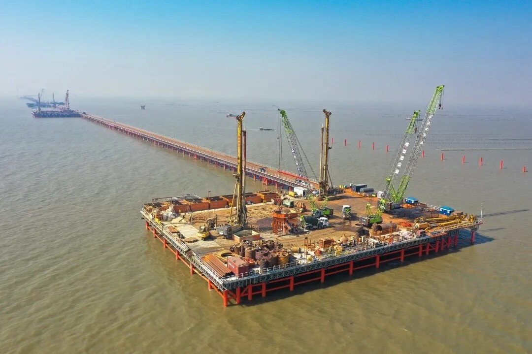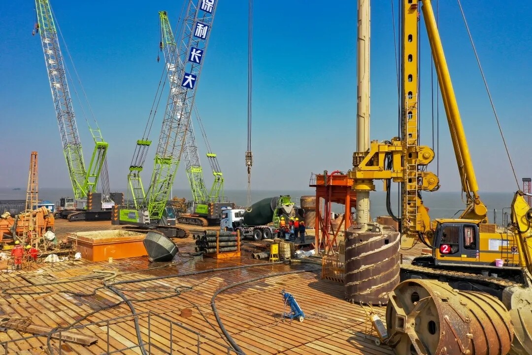 桩基施工需要经历定位勘测、钻进成孔、清孔并检查成孔质量、下放钢筋笼、二次清孔、灌注水下混凝土、拔出护筒、检查等多道工序,且面临海上众多不确定因素,施工人员24小时分批施工,完成一根桩基施工大约需耗时10天。