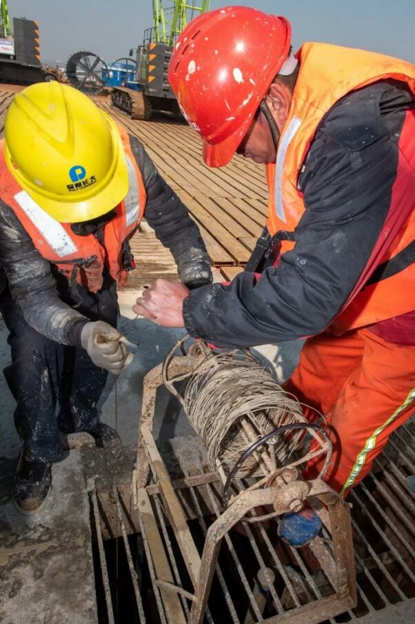 ▲施工人员在测量桩基灌注深度