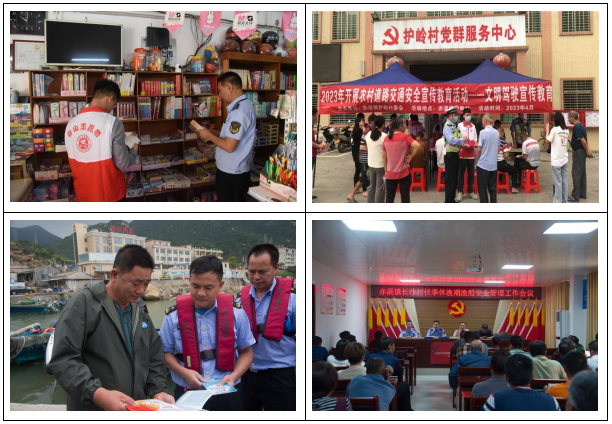 为进一步扩大安全宣传教育覆盖面,赤溪镇通过微信、政务网、手机短信等网络平台以及宣传横幅、标语、电子屏等方式线上线下开展宣传教育。宣传办联合市监所对学校周边、书店开展“扫黄打非”宣传,严厉打击各类非法出版传播活动。利用宣传车深入到码头出海口、森林防火点等进行流动宣传,各村(社区)网格员、值班点利用移动音箱、大喇叭循环播放海上安全作业宣传、森林防火、景区安全提醒等内容,引导群众遵守法律法规,安全作业。4月19日,联合交警中队在护岭村党群服务中心开展文明驾驶宣传教育,引导群众自觉遵守交通法规。4月27日,农办、执法办、宣传办联合市监所、派出所、海监等部门力量,在码头上岸点进行安全宣传,提醒渔民群众注意安全,依法进行海上作业。组织渔民群众在长沙村召开伏季休渔期渔船安全管理工作会议,宣传相关法律政策,并签订安全承诺书,强化群众依法出海用海的认识。