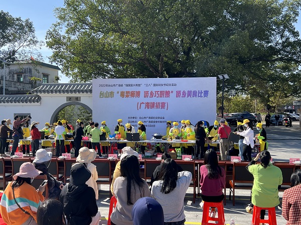 为了弘扬中华民族的饮食文化传统,引导“绿色、健康、营养”的科学消费理念,充分展示妇女们的风采,提供交流互动的平台,增进邻里情,同时,充分挖掘广海镇本土美食文化,展示具有广海饮食文化特色,3月8日上午,广海镇妇联在靖安村新时代文明实践广场举办2022年“强国复兴有我”“三八”国际妇女节纪念活动——“粤菜师傅 侨乡巧厨娘”侨乡美食比赛初赛。以村(社区)妇联组织为单位组建9支“侨乡巧厨娘”队伍,以“强国复兴”为主题自由制作菜式,以广海特色农产品咸鱼为食材。各村(社区)妇女主席、巾帼志愿者代表、妇女代表等100多人参加活动。