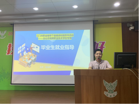 在台山市培英职业技术学校,江门市职业指导下基层讲师团成员夏永明老师以“毕业生就业指导”为主题,从职业规划、企业招聘流程、招聘渠道、简历制作等就业技巧方面给予毕业生指导,使毕业生掌握相关技巧,找到自己满意工作,为学生就业增加了信心。此次授课通过“线下”主会场和“线上”分会场同步进行,主会场安排在阶梯室,有近百名学生线下参与,分会场安排在各班课室通过直播软件进行直播指导。