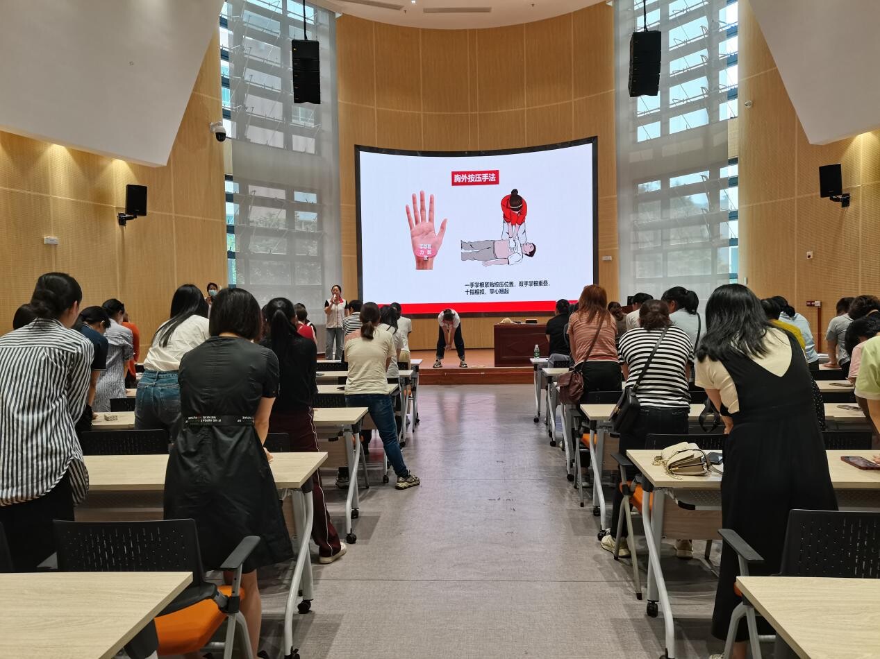 培训课堂上,红十字会讲师通过理论讲解的方式为全体参训人员阐述了急救的重要性以及急救的基本要素,着重详细讲解了现场心肺复苏术理论课程、自动体外除颤器(AED)的使用及示范、气道异物梗阻处理方法和流程。