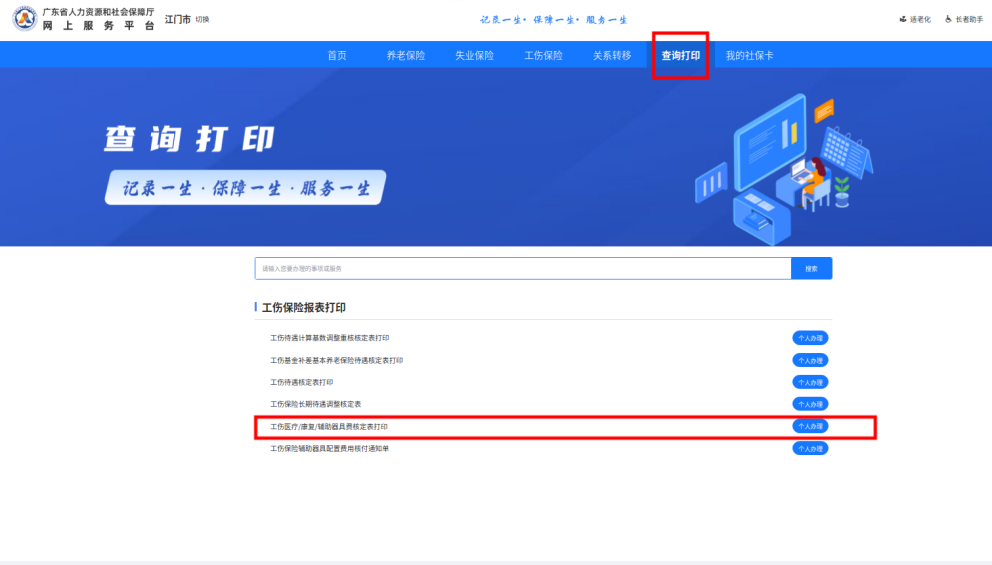 例如:你需查询工伤医疗费报销明细,你可选择“工伤医疗/康复/辅助器具费核定表打印”点击“个人办理”即可查看工伤医疗/康复/辅助器具费待遇明细。如需打印费用核定表,还可点解点击后方“打印”按钮,在家或单位便可轻松打印。