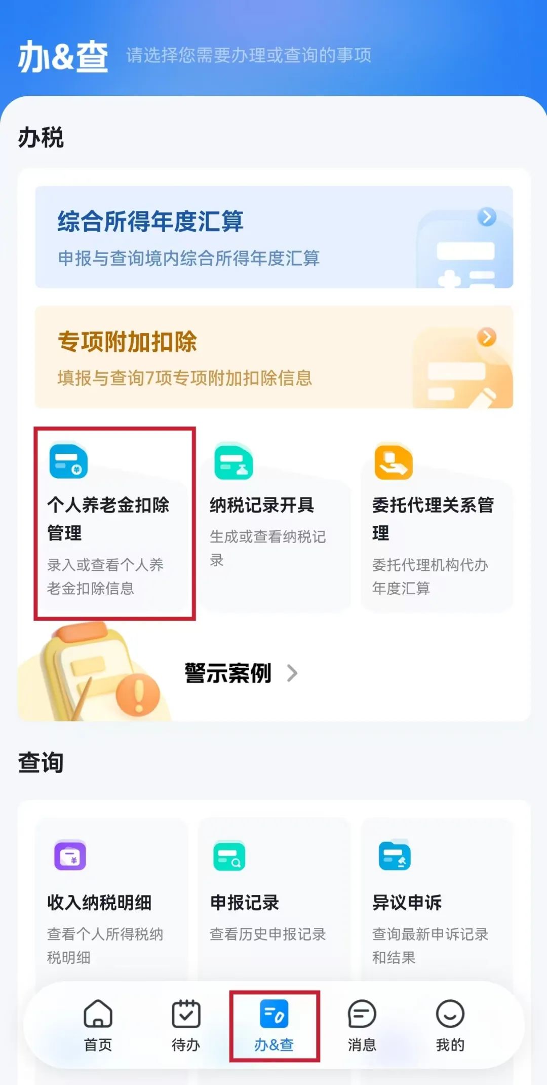登录【个人所得税APP】,点击首页下方【办&查】,进入【个人养老金扣除管理】功能。
