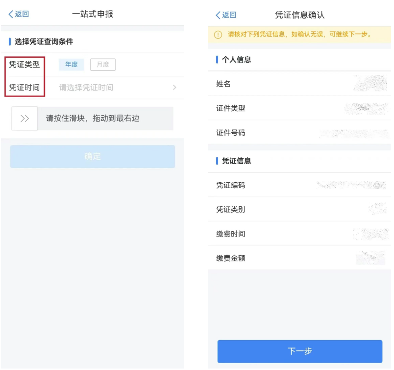根据实际情况,选择【凭证类型】和【凭证时间】,滑动验证条点击【确定】,查询本人有效的个人养老金缴费凭证信息,确认无误后,点击【下一步】。