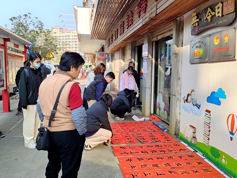 现场群众热情高涨,或欣赏着书法家们的精彩创作,或认真挑选心仪的对联内容,或有序排队静候书法家们祝福。工作人员和志愿者们帮忙传递纸墨、抻红纸、把写好的春联摆好晾干。拿到春联的群众脸上洋溢着喜悦的笑容,伍大伯表示:“政府每年举办这样的活动非常有意义,这种传统的书法春联比市面上印刷的春联更加有意义,更能烘托出春节的节日氛围,文化气息非常浓厚。”