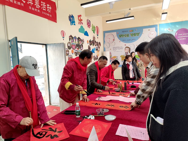 活动现场,墨香四溢,4位书法家们挥毫泼墨,笔走龙蛇。篆书、隶书、楷书、行书等各种书体的春联琳琅满目,“金蛇贺岁家宅旺 紫燕迎春富贵长”“金蛇迎春”“心想事成好运来 蛇年大吉鸿运来”“蛇展宏图”等一幅幅寓意吉祥的春联和饱满厚重的“福”字一气呵成,他们在红纸上尽情挥洒,将对新年的美好祈愿融入到一笔一画之中。