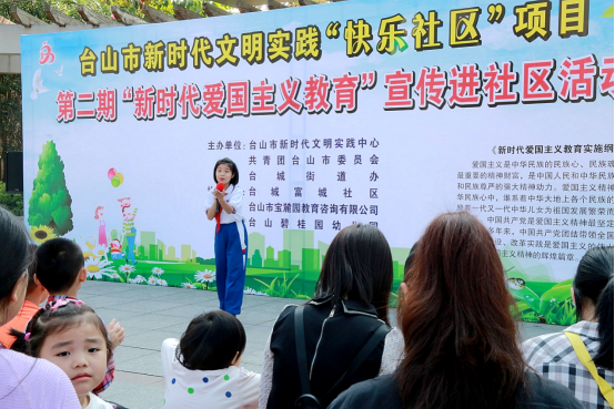 为贯彻中共中央、国务院印发的《新时代爱国主义教育实施纲要》,近日,台山市新时代文明实践中心、共青团台山市委员会、台城街道办事处共同举办“快乐社区”项目第二期“新时代爱国主义教育”宣传进社区活动,100多个亲子家庭及志愿者共200人参加了本次活动。