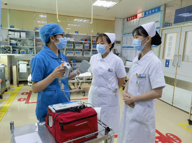上午8时,台山市人民医院急诊科护士长赵小瑜戴上燕尾帽,穿上工作服,洗手消毒,准时出现在急诊科交班,对科室的药品、仪器、设备等进行仔细检查。