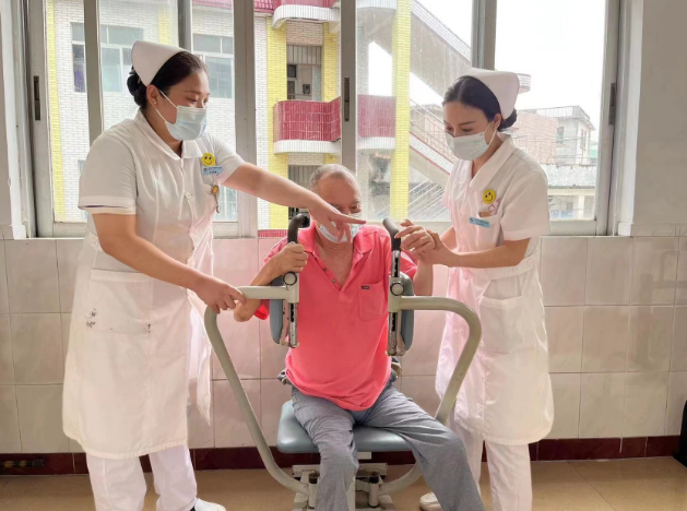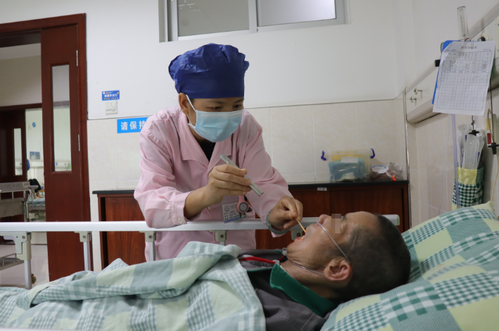 下午4时,广海镇中心卫生院康复科护士长陈欢来到患者的病床边,照料患者翻身,为患者更换床单、被褥,用暖心的话语鼓励患者。