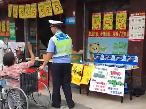 8月17日,交通辅警将坐轮椅妇女送至目的地