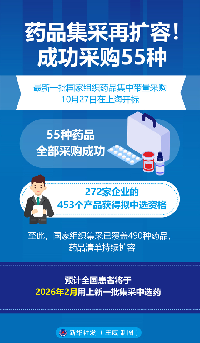 最新一批国家组织药品集中带量采购10月27日在上海开标,55种药品全部采购成功,272家企业的453个产品获得拟中选资格。至此,国家组织集采已覆盖490种药品,药品清单持续扩容。