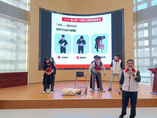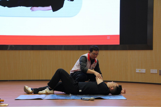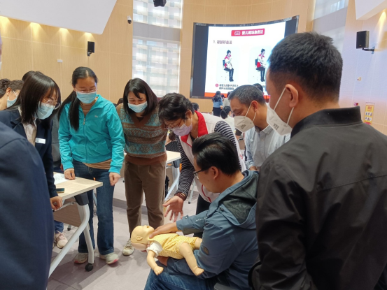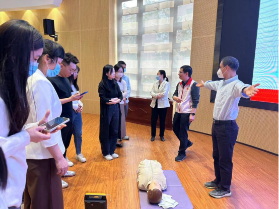 活动现场,红十字会讲师首先通过理论讲解的方式为全体参训人员阐述了急救的重要性以及急救的基本要素,着重详细讲解了现场心肺复苏术理论课程、自动体外除颤器(AED)的使用及示范、气道异物梗阻处理方法和流程。