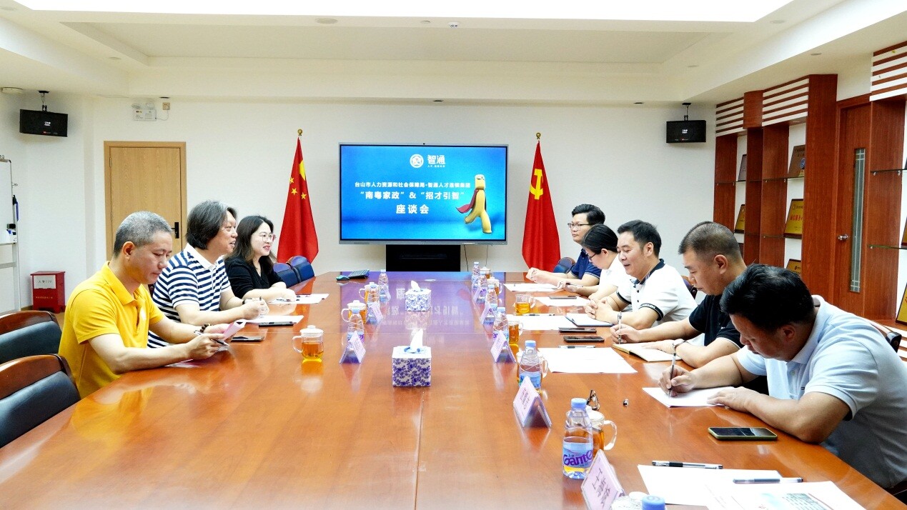 在智通人才总部办公楼,考察交流组深入了解智通人才在大数据、招才引智、家政培训服务领域的创新做法和精细管理。市人社局、市技工学校、智通人才开展政校企座谈,就台山市家政服务、人力资源服务的市场需求等展开深入交流,共同探讨合作的可能性,为台山市的家政技能培训、人才培养、市场开拓以及人力资源服务业的发展提供了新的思路。