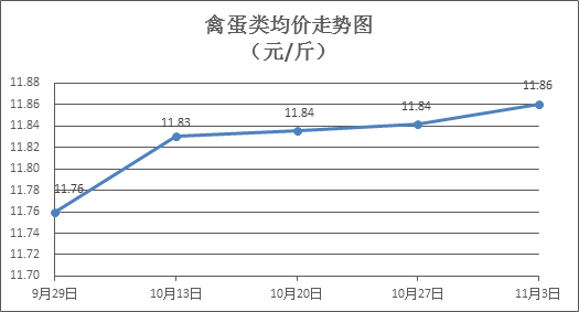 禽蛋类商品价格微幅盘整。所监测的5种禽蛋类商品价格波动情况为2涨3跌,综合零售均价为每斤11.86元,环比上涨0.14%。其中:白条鸡、白条鸭零售均价分别为每斤20.44元、15.36元,环比分别上涨0.41%、下降0.02%;鸡蛋、鸭蛋零售均价分别为每斤6.55元、7.76元,环比分别上涨0.46%、下降0.37%。