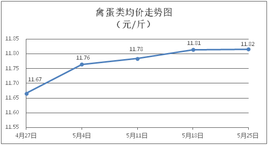 禽蛋类商品价格窄幅盘整。所监测的5种禽蛋类商品价格波动情况为3涨1跌1平,综合零售均价为每斤11.82元,环比上涨0.02%。其中:白条鸡、白条鸭零售均价分别为每斤20.75元、15.27元,环比分别上涨0.14%、下降0.26%;鸡蛋、鸭蛋零售均价分别为每斤6.64元、7.20元,环比分别上涨0.15%、上涨0.14%。