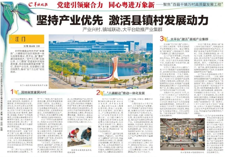 乡村凭借各自特长开辟“致富路”,八镇联动打造区域协调一体化发展新模式,筑平台、造“集群”激活县域经济。“百千万工程”实施以来,江门围绕“促进城乡区域协调发展,推动县域高质量发展”目标,坚持产业优先,在县镇村三级持续发力,推动“百千万工程”初见成效。