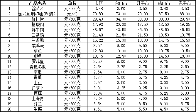 说明:1、表中价格为该地区监测点综合平均价;2、“市区”含蓬江区、江海区、新会区,价格分别采自蓬江市场、江南市场、城东市场等13家农贸市场;3、其他四个县市价格分别采自新华市场、锦江市场等8家农贸市场。