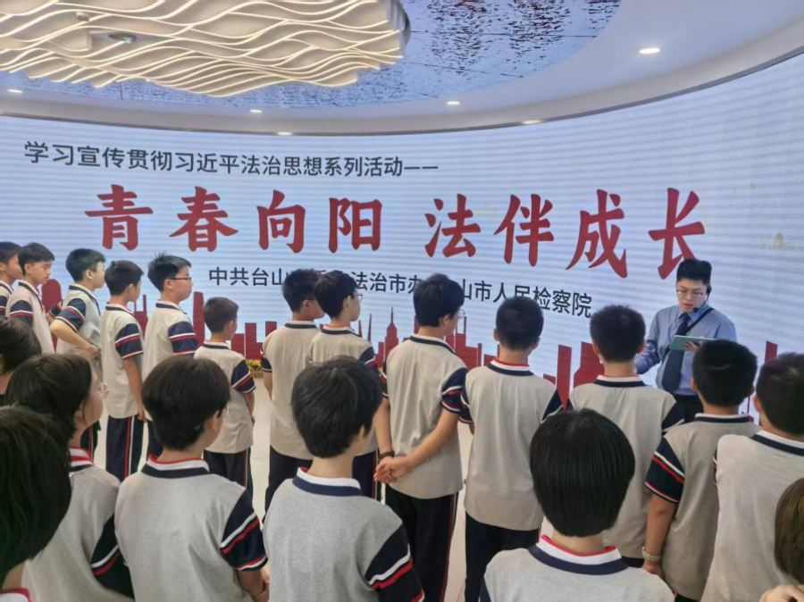 近日,在台山市青少年法治教育实践基地中,由台山市委依法治市办、台山市检察院联合举办的“青春向阳 法伴成长”学习宣传贯彻习近平法治思想系列活动如火如荼开展。台山市检察院讲解员正与同学们互动分享法治知识,在同学们一片欢声笑语中,潜移默化地传播着法治思维和理念。