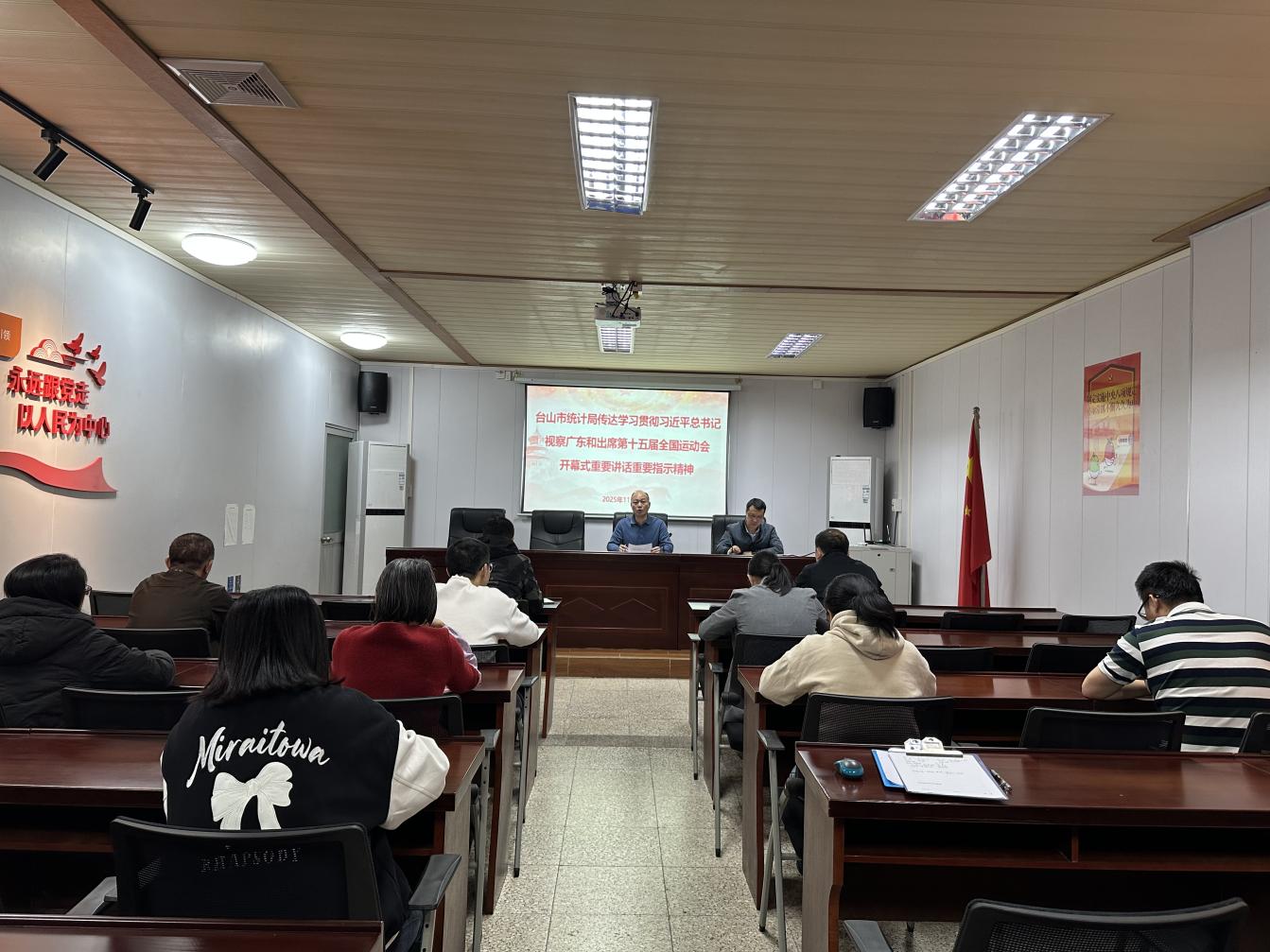 11月25日,台山市统计局召开党组(扩大)会议,专题传达学习贯彻习近平总书记视察广东和出席第十五届全国运动会开幕式重要讲话重要指示精神,以及省、江门、台山有关会议精神,研究部署贯彻落实工作,局党组书记、局长黄卫松同志主持会议,局班子成员、全体党员干部参加会议。