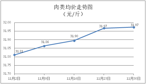 肉类商品价格微幅波动。所监测的肉类商品价格波动情况为3涨2跌3平,综合零售均价为每斤31.97元,环比上涨0.02%。其中:排骨、精瘦肉、牛肉、带骨羊肉零售均价分别为每斤30.10元、18.38元、46.96元、41.43元,环比分别下降0.36%、下降0.11%、持平、上涨0.19%。