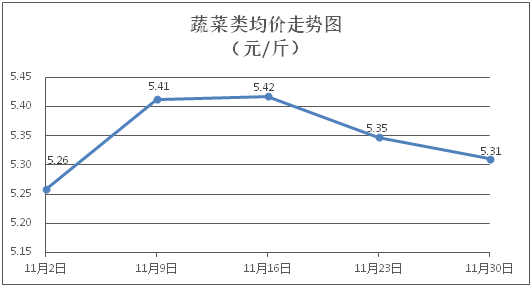 据本市21家农贸市场监测数据显示,上周(11月24日至11月30日)市场上各类“菜篮子”商品供应充足,所监测的7大类“菜篮子”商品价格环比总体表现为4涨3跌。其中:粮油类、肉禽蛋类商品价格稳中略涨,蔬果类、水产类商品价格总体略降。