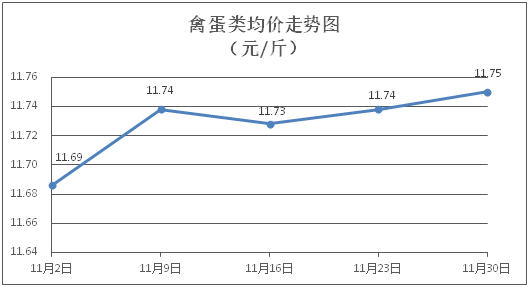 禽蛋类商品价格稳中有涨。所监测的禽蛋类商品价格波动情况为1涨4平,综合零售均价为每斤11.75元,环比上涨0.10%。其中:白条鸡、白条鸭零售均价分别为每斤21.01元、15.27元,环比分别上涨0.29%、持平;鸡蛋、咸鸭蛋零售均价分别为每斤6.35元、8.93元,环比均持平。