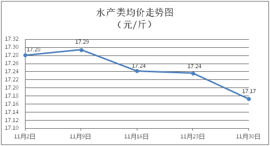 水产类商品价格有所下降。所监测的水产商品价格波动情况为1涨5跌3平,综合均价为每斤17.17元,环比下降0.37%。其中:草鱼、鲫鱼、罗非鱼、基围虾零售均价分别为每斤11.39元、13.63元、8.85元、28.29元,环比分别持平、下降0.87%、下降0.34%、下降0.14%。