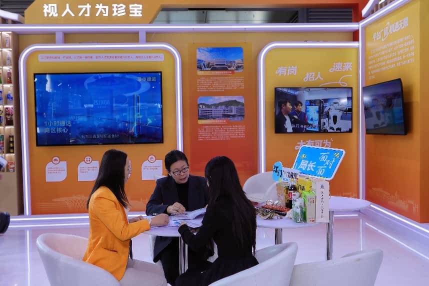 活动现场成效显著。台山市人民医院与来自齐齐哈尔医学院的优秀本科毕业生张博然现场签订就业协议。江门市人力资源和社会保障局、哈尔滨工程大学核科学与技术学院、台山核电合营有限公司成功签订政校企三方合作协议,标志着我市在协同育才、精准引才方面迈出坚实一步。台山市人力资源和社会保障局相关负责人积极参与“局长面对面”活动,化身城市“推介官”和岗位“代言人”,向广大求职者热情介绍台山区位优势、发展前景、宜居宜业的生活环境以及富有吸引力的人才政策,充分展现了台山尊重人才、渴求人才的满满诚意。我市企业凭借良好的发展平台、具有竞争力的薪酬福利和引才诚意,受到求职者广泛青睐,现场共接收简历487份,其中博士5份、硕士118份、本科357份;初步达成就业意向30人(硕士1人,本科29人);实现现场签约1人。