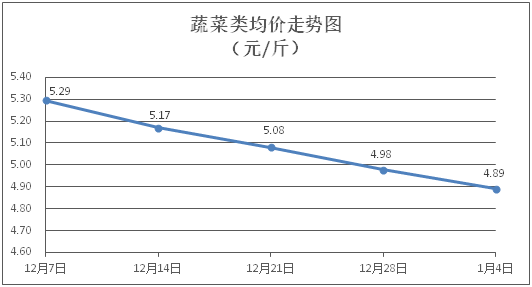 据本市21家农贸市场监测数据显示,上周(12月29日至1月4日)市场上各类“菜篮子”商品供应充足,所监测的7大类“菜篮子”商品价格环比总体表现为3涨3跌1平。其中:粮油类商品价格基本平稳,肉禽蛋类、水产类商品价格窄幅盘整,蔬果类商品价格有所下降。