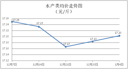 水产类商品价格微幅波动。所监测的水产商品价格波动情况为4涨3跌2平,综合均价为每斤17.20元,环比上涨0.11%。其中:草鱼、鲫鱼、罗非鱼、基围虾零售均价分别为每斤11.46元、13.93元、8.77元、28.08元,环比分别上涨0.26%、持平、下降0.23%、持平。