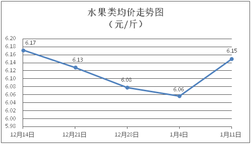 水果类商品价格小幅波动。所监测的水果商品价格波动情况为1涨4跌1平,综合零售均价为每斤6.15元,环比上涨1.54%。其中橙子、苹果、葡萄零售均价分别为每斤5.69元、7.90元、12.13元,环比分别下降2.40%、下降0.63%、上涨7.16%。