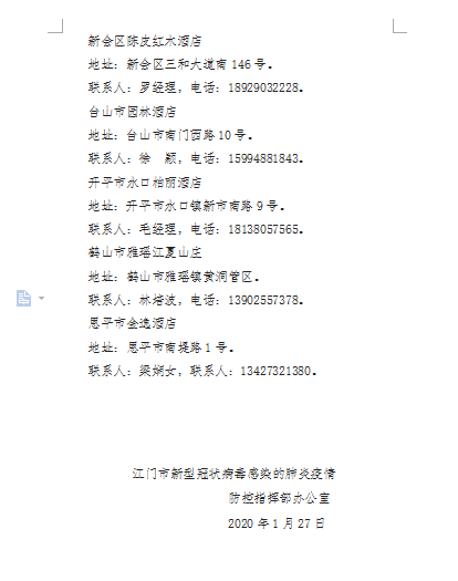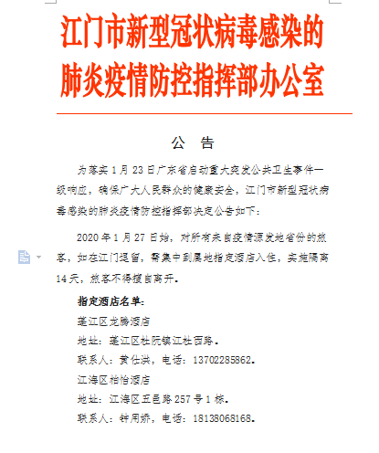 江门市新型冠状病毒感染的肺炎疫情防控指挥部办公室