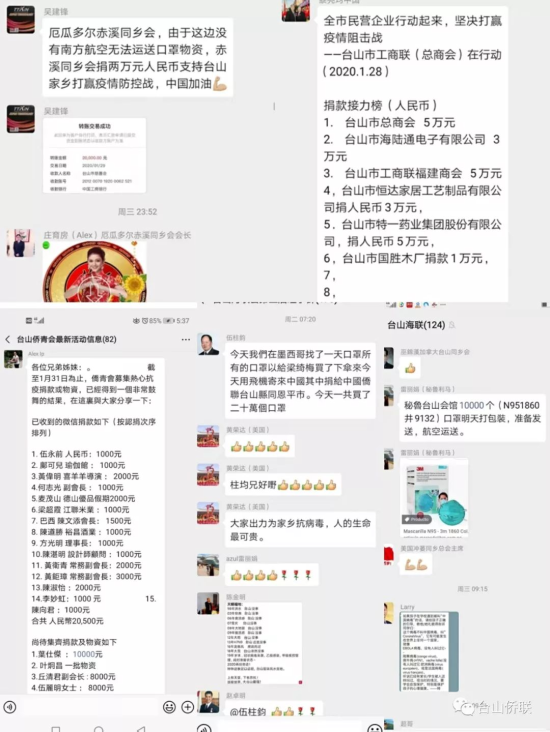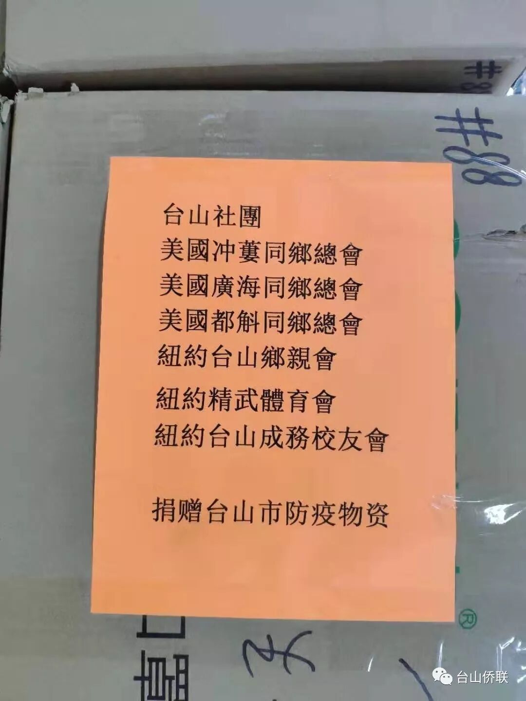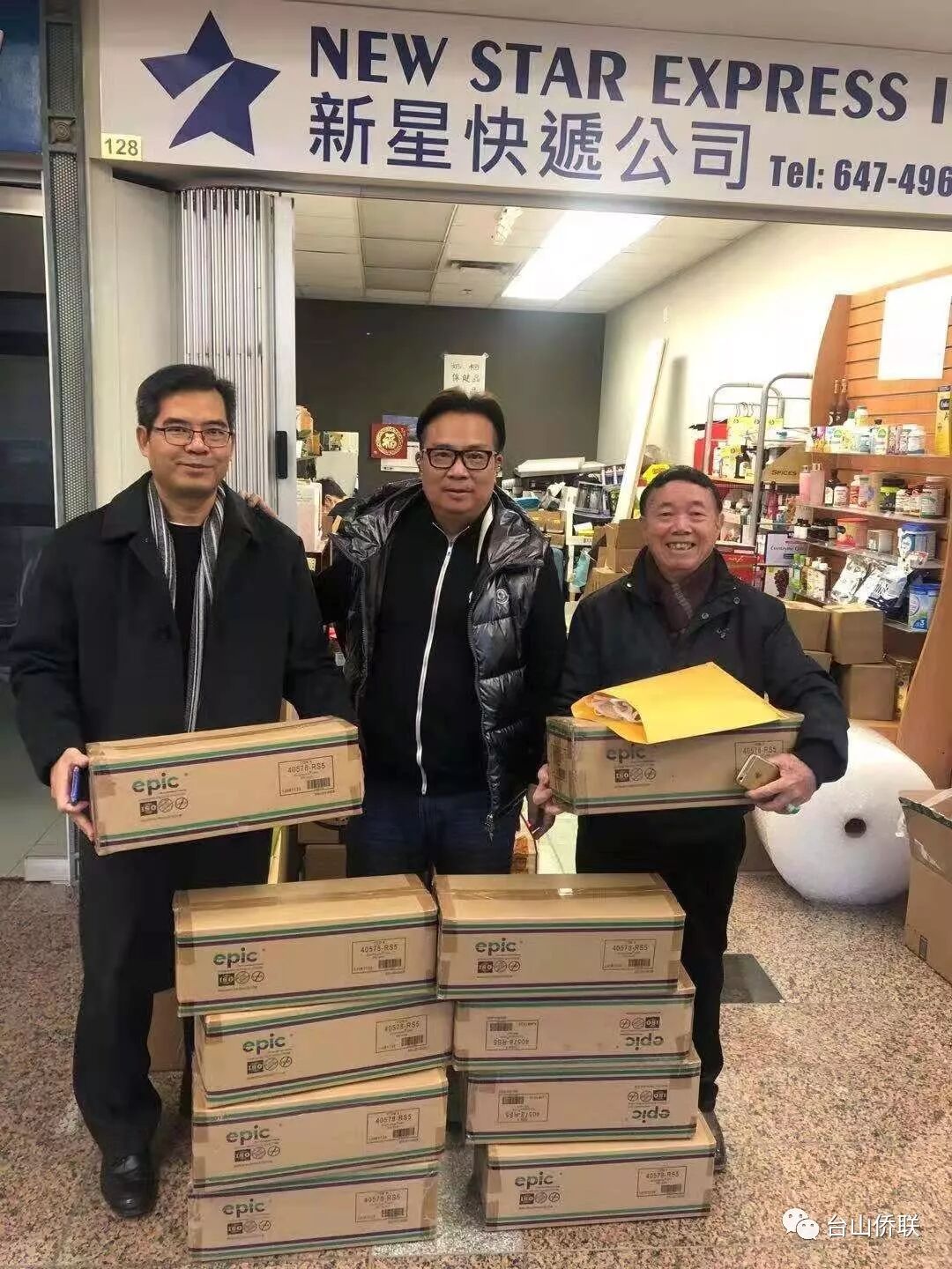 得知祖国疫情爆发,海外侨胞心急如焚。市侨联和相关部门及时与海外侨团、侨界重点人士沟通家乡情况,在得知家乡口罩、防护服和体温测量仪等物资紧缺的情况后,海外侨团、侨胞纷纷行动,展现出台山人爱国爱乡的精神。 美国众多台山侨团立刻在微信群里号召团结一致募集相关物资,并马上传来好消息,募集数万医用口罩通过南方航空运回家乡,得知家乡急需体温测量仪不管该型号的体温测量仪大幅涨价,纽约侨胞依然不遗余力,有钱出钱,有力出力,守在电脑和电话前沟通抢购,成功订购一批体温测量仪,物资到位后立刻安排分批运回家乡。
