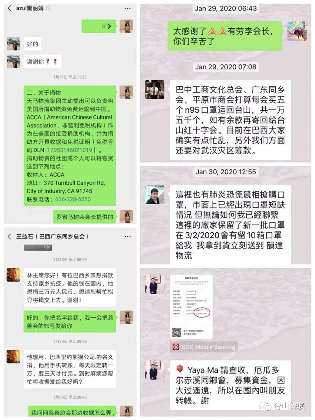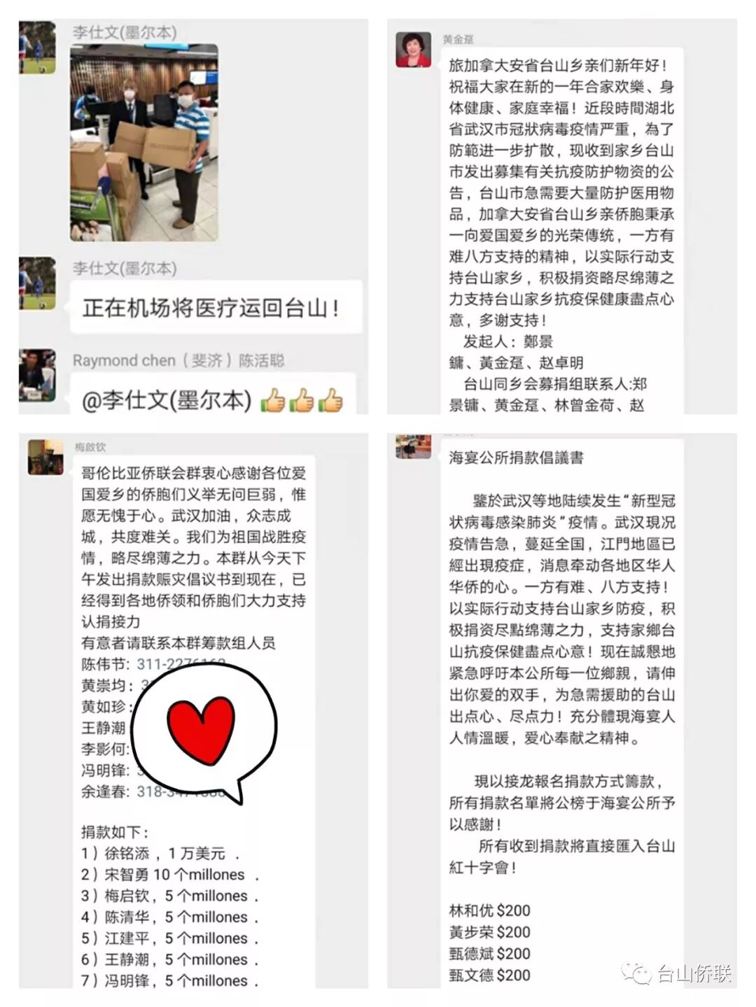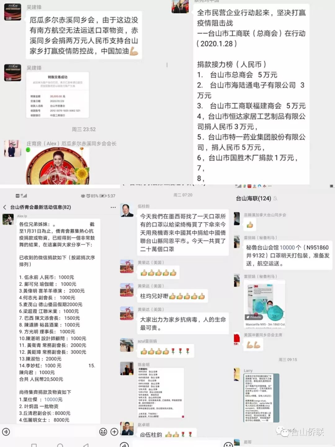 疫情爆发以来,按照市委的统一部署,台山市侨联先后与美国、加拿大、墨西哥、巴西、秘鲁、伯利兹等27个国家和地区的80多个社团和企业沟通联系,海内外台山人纷纷利用其商贸渠道,购买和捐赠口罩、手套、防护服、护目镜等疫情防护用品,并协助相关部门联系各个国家防护产品的供货商。虽然也遭遇过因航班交通等原因而被迫滞留的情况,焦急地红了眼眶发出求助,经过相关部门和海内外台山人的多方努力,目前已经打通了一些供货和运输渠道。这些可爱可亲的海内外台山人正与全国人民一起,众志成城,一定能打赢疫情防控阻击战!