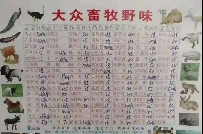 曾有媒体报道指出,在武汉华南海鲜市场价目表上,售卖的野味中包括了孔雀、大雁、鸵鸟、狐狸等野生动物,甚至连果子狸都在售卖。下面还注明:活杀现宰、速冻冰鲜等。