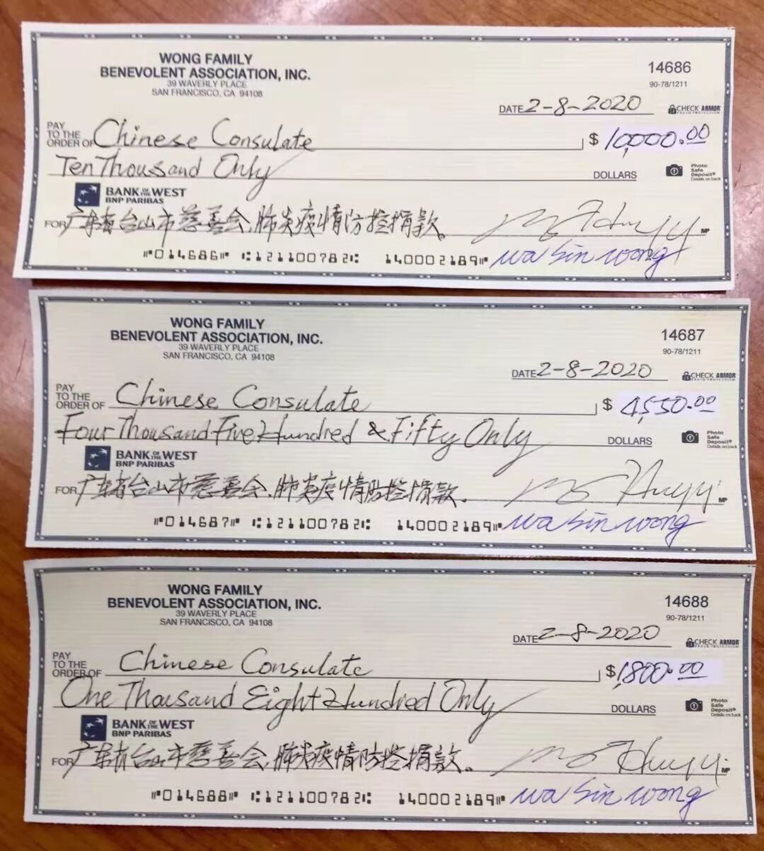 这次全美黄氏宗亲总会共筹得16350美金,捐给台山市慈善会,用于肺炎疫情防控。该会一直以来都十分重视和热心公益慈善事业,汶川大地震、非典时期都秉持着大爱无疆、助人为乐的精神尽力地捐助受灾人民渡过难关。