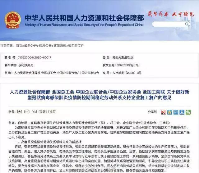 人社部等7日印发《关于做好新型冠状病毒感染肺炎疫情防控期间稳定劳动关系支持企业复工复产的意见》: