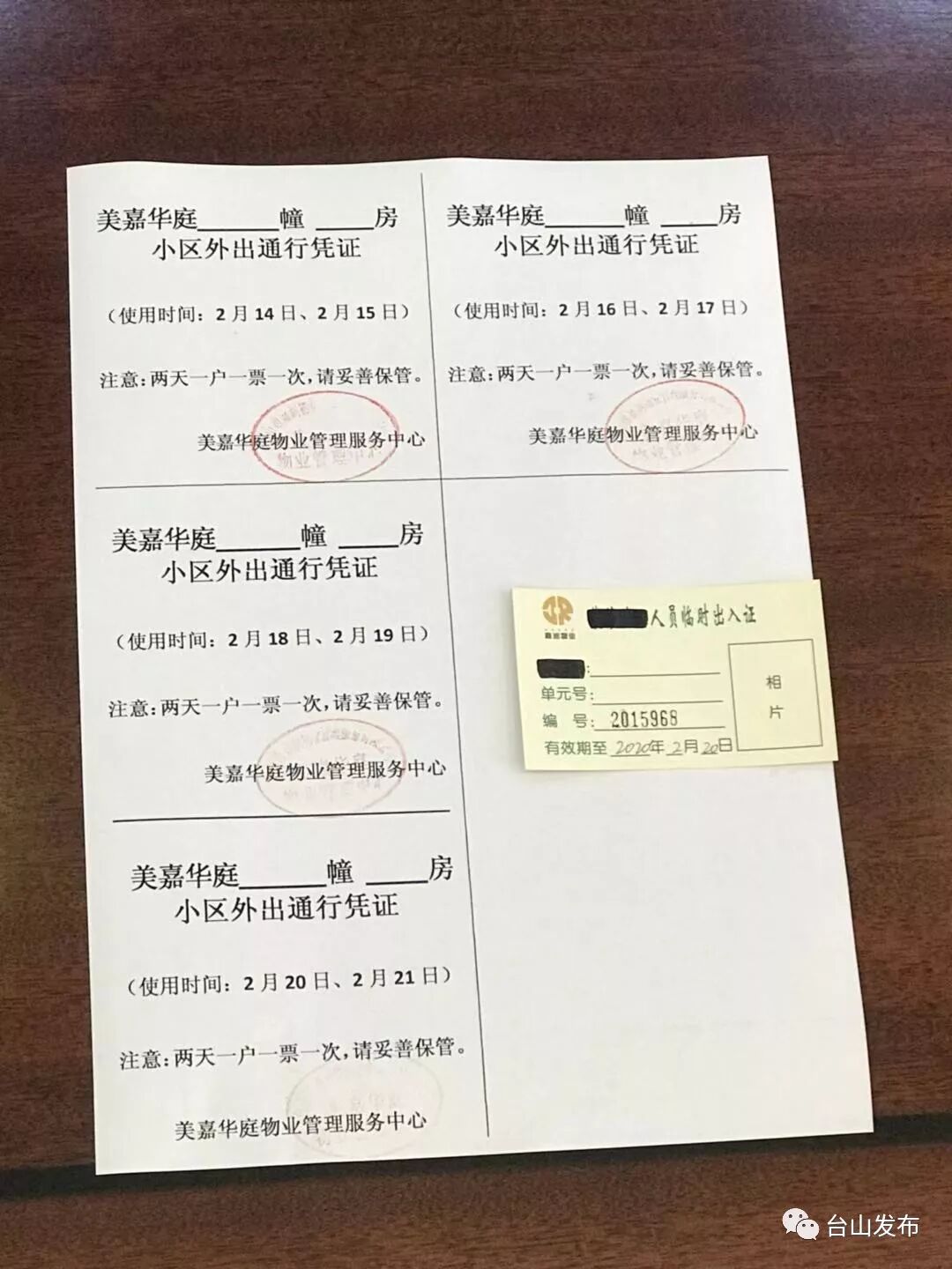 上午十点,在美嘉华庭生活小区,记者看到,需要外出的业主在向保安人员出示通行凭证后,才可以离开小区。每一张通行凭证上面都写有使用时间,注明一人一票只能使用一次。也有一些业主手持人员临时出入卡,卡上写了业主个人信息,业主可凭卡多次出入小区。
