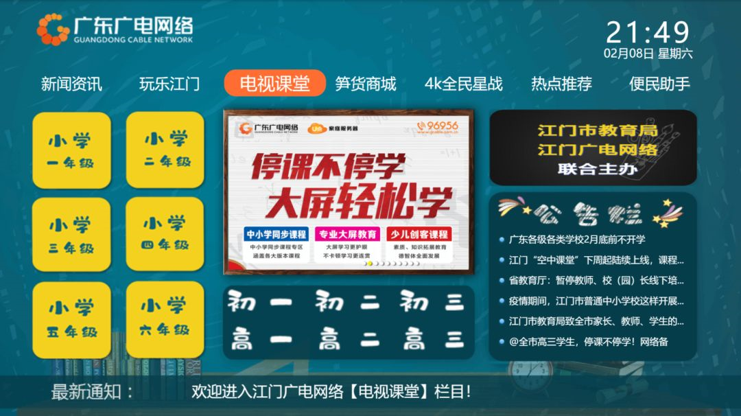 1、学生还可以把光标移动到「视频框」点击确认,视频框即可全屏播放,按遥控器“退出键”退出当前视频。 2、点击「课程表」,将可查看该年级最近的课程表安排。 3、学生还可以通过【电视课堂】首页右下方「公告栏」查看教育局下发的最新动态。