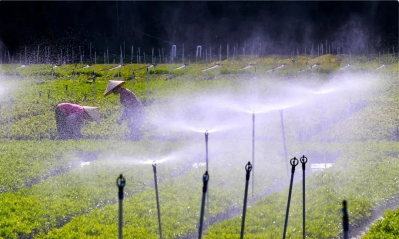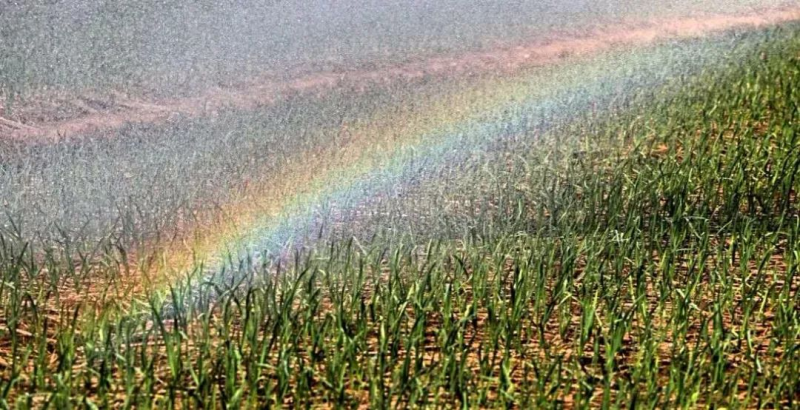 花田在阳光下享受着喷洒滋润