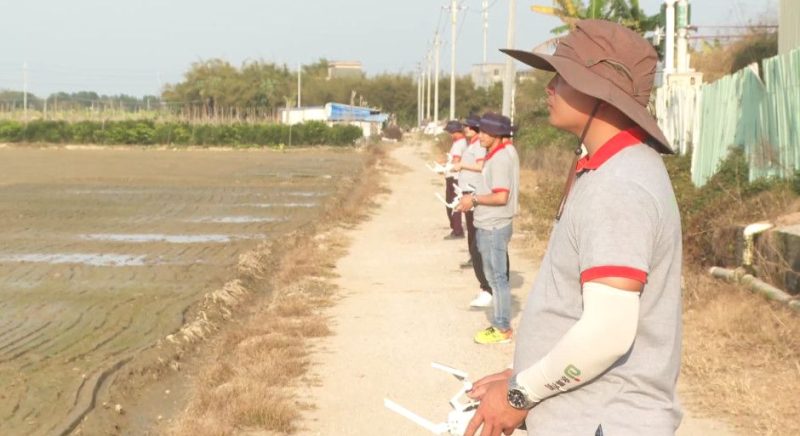 手拿着遥控器站在田埂上