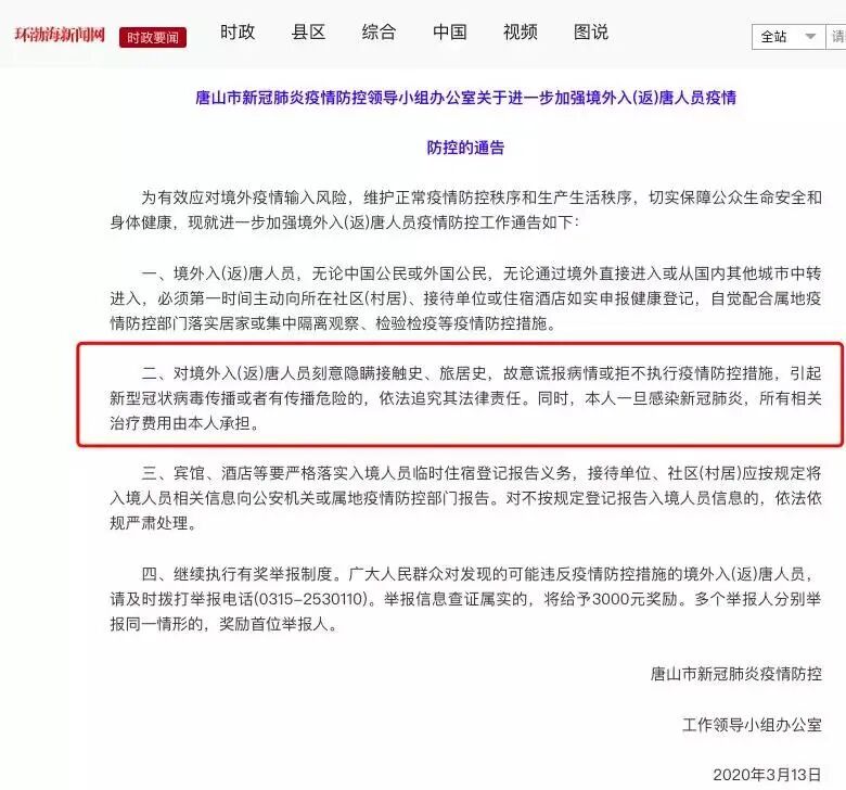 据环渤海新闻网报道,河北唐山市3月13日发布公告,对境外入(返)唐人员刻意隐瞒接触史、旅居史,故意谎报病情或拒不执行疫情防控措施,引起新型冠状病毒传播或者有传播危险的,依法追究其法律责任。同时,本人一旦感染新冠肺炎,所有相关治疗费用由本人承担。