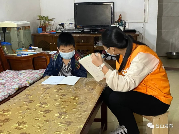 上午十点,社工黄巧凤带着志愿者杨河山上门,为刚上完在线课程的强仔提供功课辅导。志愿者杨河山是五邑大学的学生,在了解到广海镇社工站招募志愿者的信息后,便报名参加这项“上门送教”的志愿服务。