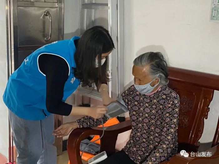 在志愿者辅导功课的同时,社工黄巧凤也没有闲着,拿出了随身携带的血压计,为婆婆测量血压,并提醒婆婆记得按时吃降压药。