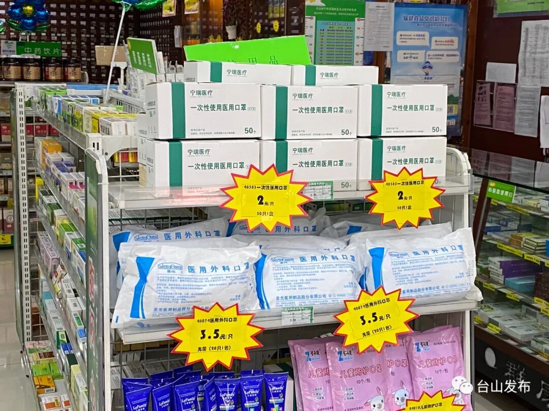 上午十一点,记者来到台城某药房,见到店内最显眼的货架上摆放着满满当当的口罩、酒精以及洗手液,黄色的价格牌上面写着一次性使用医用口罩两元一只,医用外科口罩三块五一只。