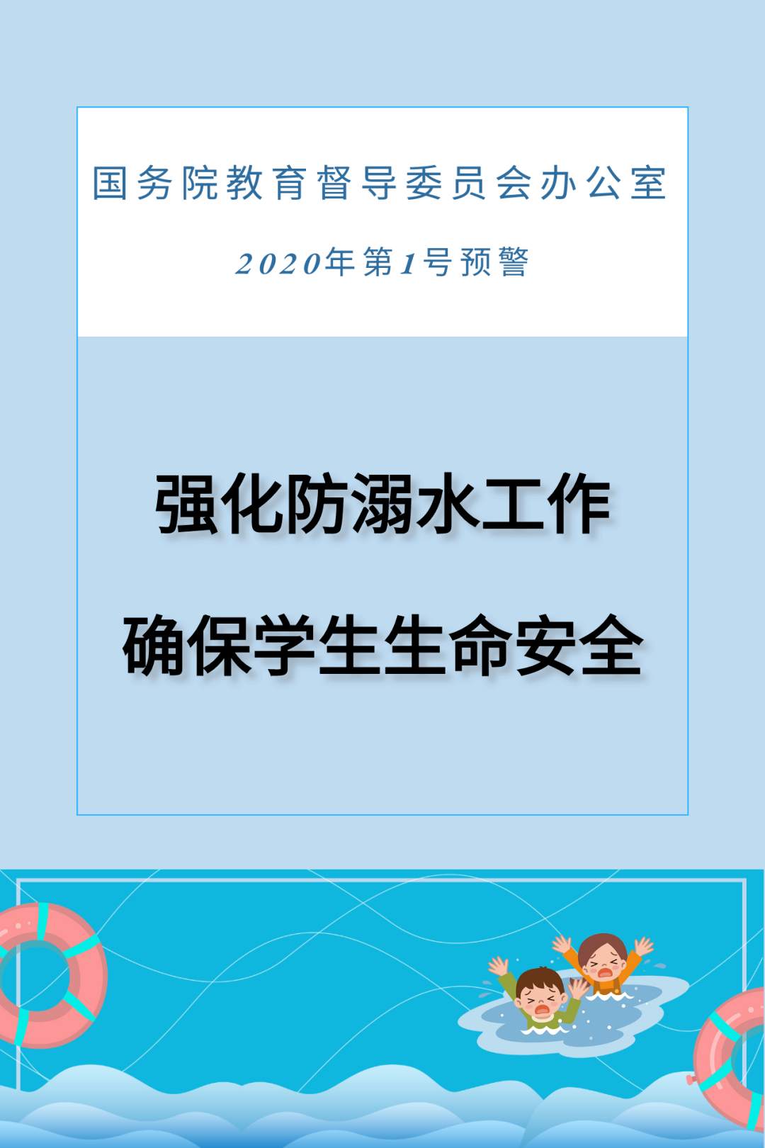 随着天气越来越热 疫情防控风险等级降低 孩子的户外活动增多 玩水和游泳的机会也随之增加 “溺水”事故也频频出现! 事故案例 ▶3月31日,云南怒江州泸水市上江镇蛮英村6名少年在怒江边游玩时发生溺水事件,导致一名16岁少年溺亡。 ▶3月27日,云南文山州广南县珠琳镇发生一起5名儿童水库游泳溺水死亡、砚山县阿猛镇发生一起2名儿童坝塘游泳溺水死亡事件。 ▶4月18日,4名中小学生到南宁市西乡塘区石埠街道老口村一鱼塘玩耍时,不慎落水,其中3人不幸溺亡。 4月3日 国务院教育督导委员会办公室 发布2020年第1号预警 事关每个学生生命安全 暑假是溺水高发期, 如何正确营救溺水者? 关于溺水的误区你知道多少? 戳图 ↓ 涨知识!转发周知! 安全永远第一位, 别让悲剧发生!
